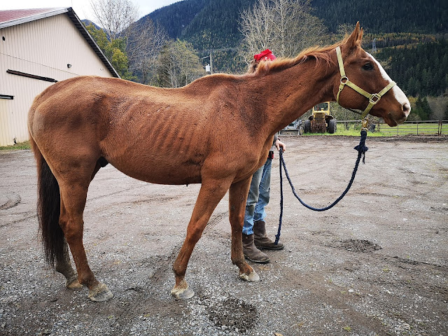 In other horsey news, over the Thanksgiving weekend (#Canada) Ray, Eowynn and I travelled to spend it with my family in British Columbia. Last summer, we took one of our older OTTB's to my 12 year old niece, a beginner rider with very little formal knowledge, to ride and love because her horse that a neighbor gave her had recently passed away and she was heart broken. King is a 2006 OTTB that was often mistaken for a Quarter Horse due to his thick build and easy-keeping abilities. Unfortunately, King did not adjust well to their limited turn out space, extreme snow loads and different type of hay in the area. As such, he dropped a significant amount of weight and condition. It was brought to my attention in the spring when we went there to visit, and together we worked out some changes that included them catching him every night and removing him from the paddock to be fed his mash because his buddy was aggressive and often stole his food - something very odd in itself considering previously, King had several horses he couldn't be turned out with due to being so incredibly aggressive. By June, things were trending upward and he had began putting weight back on however as winter approached things began to decline again and I had to make a decision.